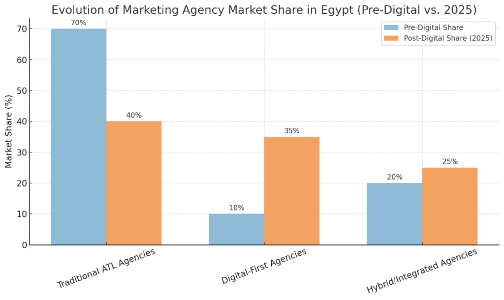 The digital transformation has reshaped Egypt’s marketing agency ecosystem, shifting power away from a few dominant traditional players toward a more diversified landscape of digital-first and hybrid agencies. Where once legacy ATL agencies controlled up to 70% of market share, recent estimates indicate a sharp decline to 40% by 2025, as shown in the table below: